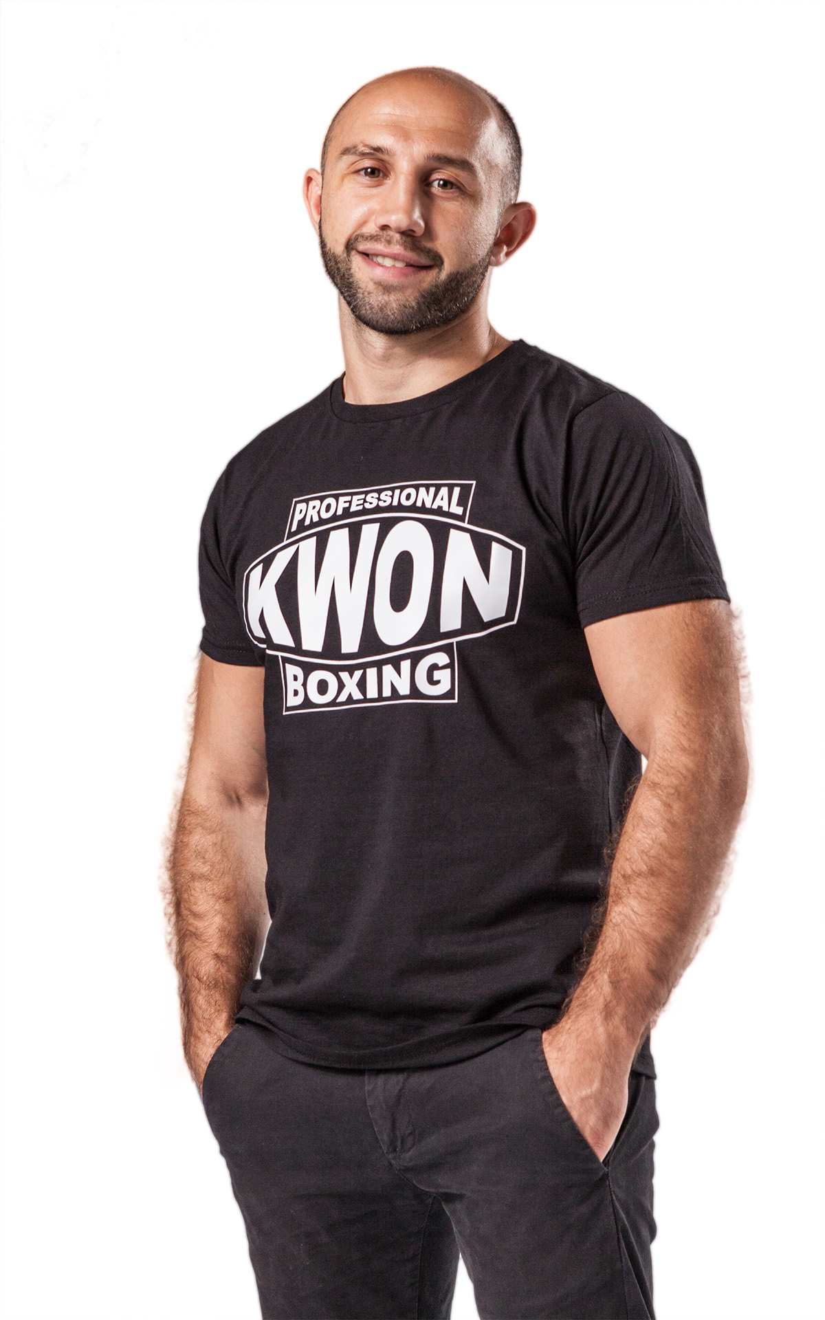 Hochwertiges schwarzes T-Shirt mit großem Prof.Boxing Druck auf der Brust. Modischer, körperbetonter Schnitt. 100 % Baumwolle
